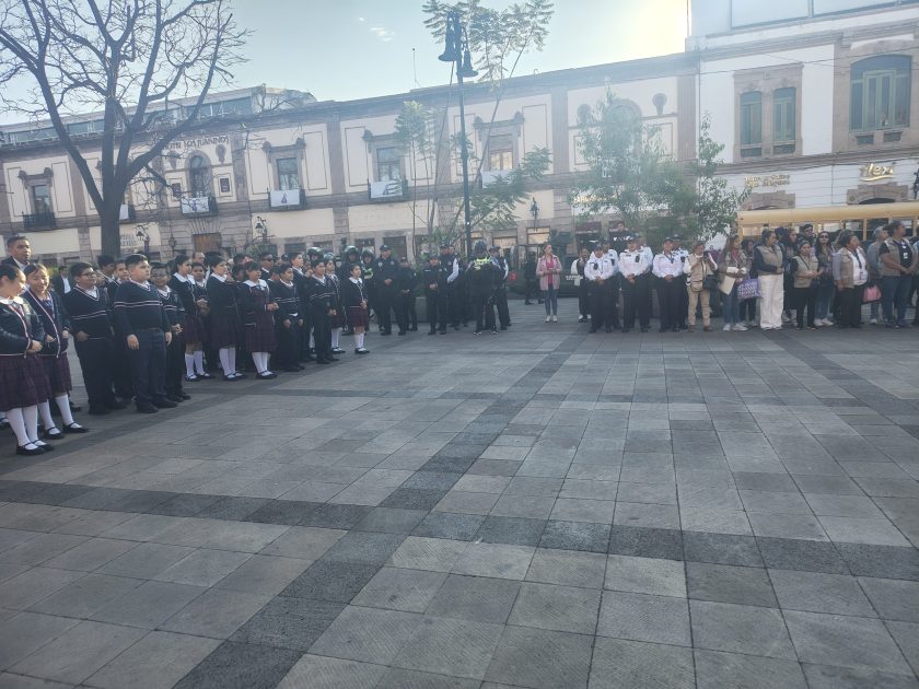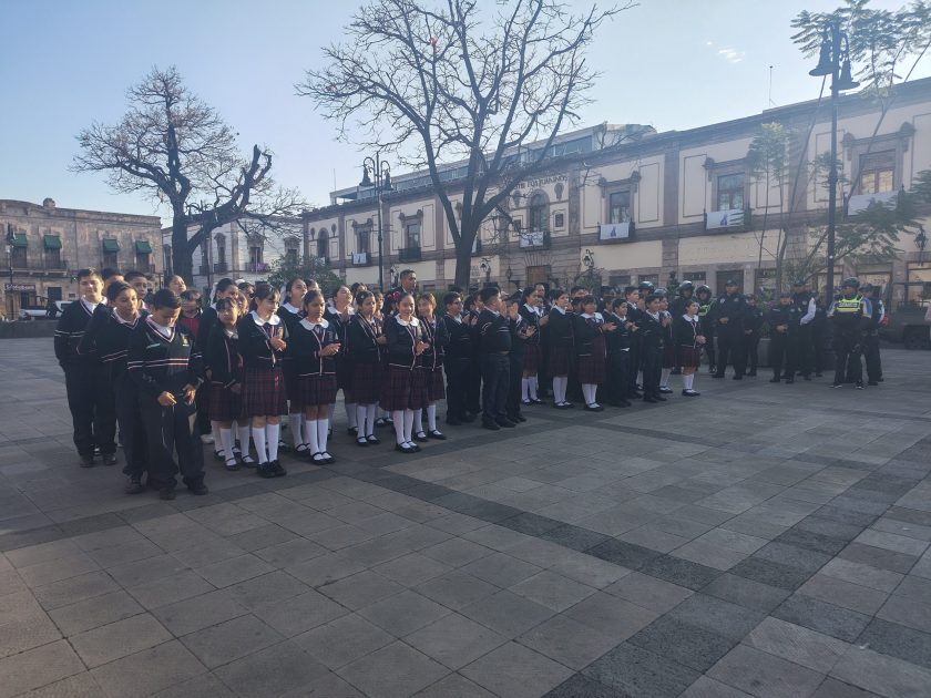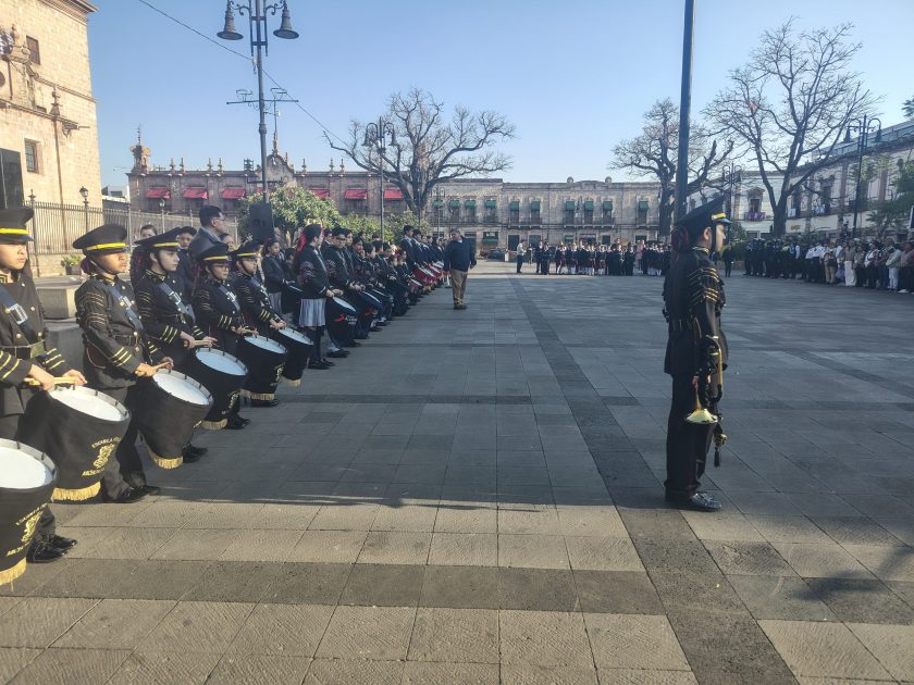 Morelia, Michoacán, 24 de marzo de 2026.— La Banda de Guerra de la Escuela Primaria Michoacán encabezó los honores al Benemérito de las Américas en el aniversario de su natalicio, acompañada por la banda de la Salle y la escolta de la propia primaria.