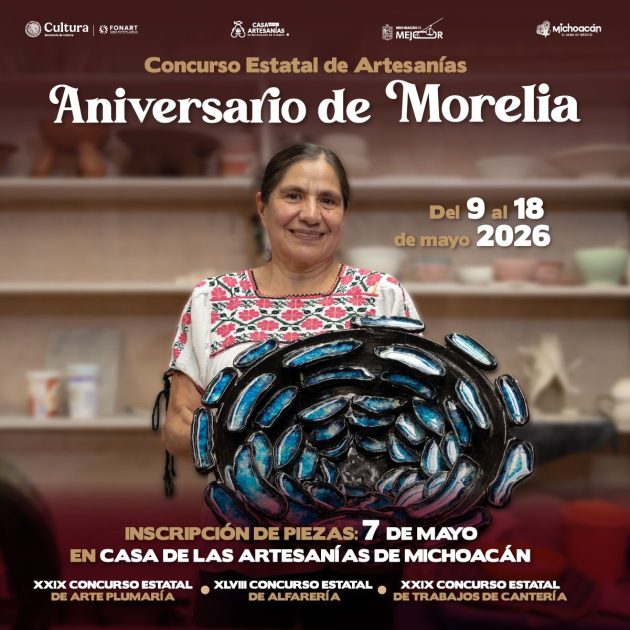 Morelia, Michoacán, 28 de abril de 2026.– En el marco del 485 aniversario de la fundación de Morelia, la Casa de las Artesanías de Michoacán (Casart) anunció la realización de la edición 48 del Concurso Estatal de Alfarería y la edición 29 del Concurso Estatal de Arte Plumaria y Trabajos de Cantería, con una bolsa total de 260 mil pesos destinada a premiar a 60 personas artesanas.