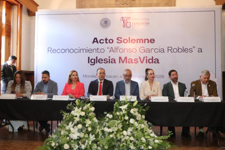 Morelia, Michoacán, 25 de marzo de 2026.- En el marco del Acto Solemne de entrega del reconocimiento “Alfonso García Robles”, el diputado Baltazar Gaona García, presidente de la Mesa Directiva del Congreso del Estado, participó en esta ceremonia en la que se distinguió a la Iglesia Más Vida por su labor en la construcción de paz y fortalecimiento del tejido social en Michoacán.