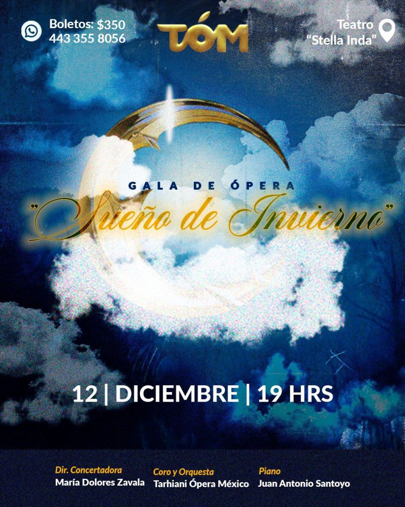 Este evento promete ser una experiencia inolvidable para los amantes del arte lírico, con dos funciones programadas: el 2 de diciembre en el Teatro Ocampo y el 12 de diciembre en el Teatro Stella Inda, ambas a las 19:00 horas.Tarhiani Ópera México, conocida por su enfoque incluyente y su compromiso con la promoción de la paz a través de la música, presentará a destacados cantantes, su coro y el debut oficial de la Orquesta Tarhiani Ópera México (TÓM), bajo la dirección de la Dra. María Dolores Zavala Esparza. El maestro Juan Antonio Santoyo, reconocido pianista y director orquestal, acompañará varios números al piano.