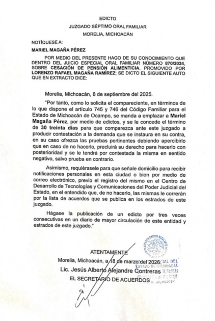 Michoacán Servicio comunitario: edicto 26 de marzo de 2026 Conciente Colectivo 12 26 marzo, 2026 FacebookTwitterWhatsAppCopy URL Artículo anteriorEntrega Poder Legislativo reconocimiento “Alfonso García Robles” a Iglesia Más VidaArtículo siguienteCon Parlamento Regional de Derechos Humanos se apuesta a una ley ciudadana: David Martínez Gowman Conciente Colectivo 12https://concientecolectivo12.com/ FacebookTwitterWhatsAppCopy URL Te puede interesarRelated Bienvenido a casa! Nace cebra de Grant en el Zoológico de Morelia Conciente Colectivo 12 - 17 abril, 2026 _Se encuentra en buen estado de salud y el... Sefeco Inaugura la Feria Educativa Villas del Pedregal 2026 Conciente Colectivo 12 - 17 abril, 2026 El evento se desarrolla de 10: 00 a 19:00... Dayana Pérez encabeza 4ta Sesión Distrital de Desarrollo Rural en Salvador Escalante Conciente Colectivo 12 - 17 abril, 2026 • Se fortalecen acciones y coordinación institucional para impulsar... Rostros del mundo con: maestra Gema Méndez Conciente Colectivo 12 - 16 abril, 2026 https://youtu.be/xqXDe0MjV74?si=4e0L_FMkyO6V9e4_